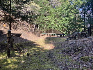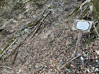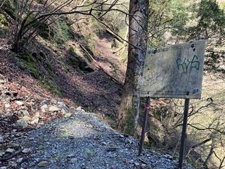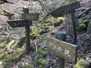 少し進むとアッチ沢本流(?)を横断するところに各種標識あり。この山神径路はもともと仕事道だったものが2000年代の初めに登山道として整備され、しばらくは『山と高原地図』にも実線ルートとして紹介されていたので、その整備の際にこれらの標識が設けられたのだと思います(山神径路の整備と廃道化の歴史については〔こちら〕を参照してください)。これらの標識の先は道がおおむね安定し、すぐにモノレール広場に到着しました。山神径路は雨山橋に向かってさらに続きますが、今日はここで山神径路を離れて玄倉川に向かってまっすぐ下ります。