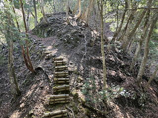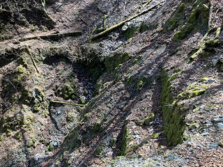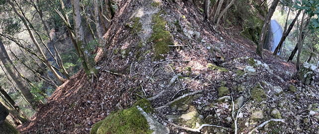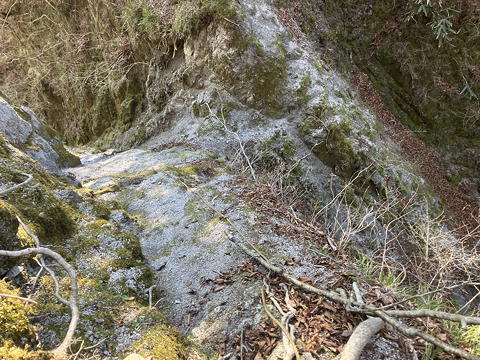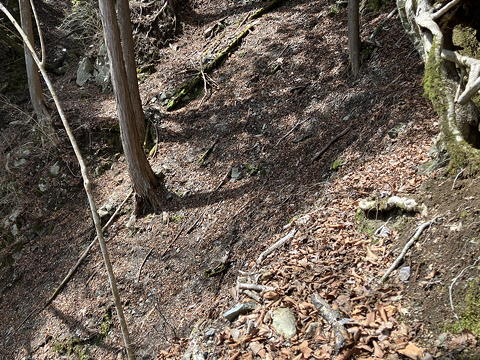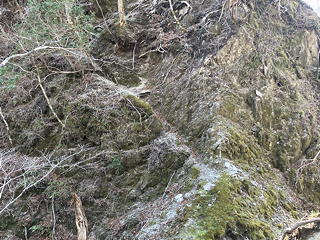 ……などとぶつくさ言っている場合ではなくなってきました。たとえばここは、角を回るところの狭い径路に山側の壁が張り出していてのけぞるような感じ。しかも左下は高さのある崖です。幸い、しっかりした木の根が出ていたのでその手助けを受けて通過しました。