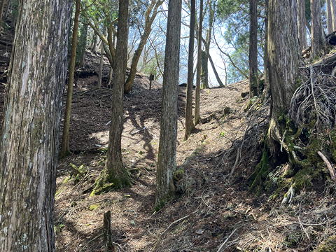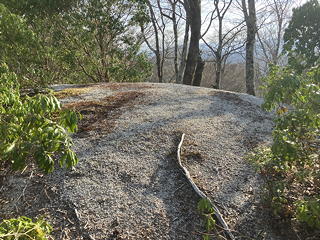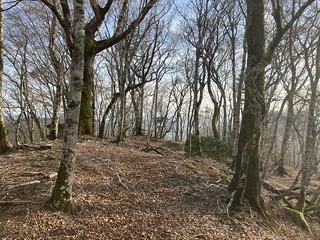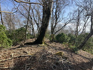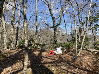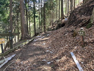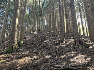 最初のうちは雑木の中の階段(土留め)を登り続けますが、やがてきれいな植林の中の淡々とした登り道になってきました。枯葉が斜面を覆っているために踏み跡は不明瞭ですが、尾根通しに歩けばいいので道に迷う心配はありません。