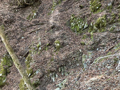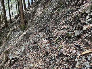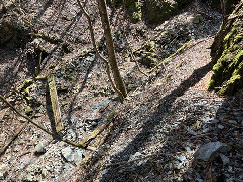 それにしても相変わらず荒れている……と言うより、荒れ具合に磨きがかかっている感じがします。初めてここを歩いたのは上述の初めて山神峠を訪れたとき=5年半前ですが、今から思えば下調べが不十分でヘルメットもかぶらず、無謀登山の一歩手前の状態でした。それでも歩き通せたのは、たぶん今ほどには道が荒れていなかったからです。