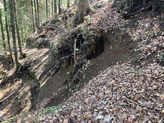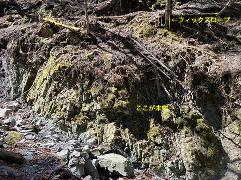 ここもひどい。たわんだトラロープがぶら下がっていますが、通れるコースはそのはるか下をきわどく通過しており、しかも土質が脆いので緊張します。