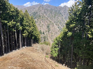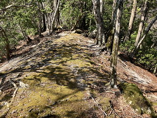 ちょっと悪いトラバースをこなして尾根の上に達し、反転して山神峠を目指すと、尾根道は先ほど通過した境隧道の上を通ります。左右に玄倉林道を見下ろしながらその上を歩くのは、なんだか不思議な感覚です。