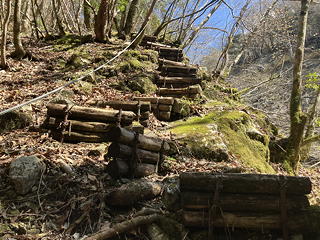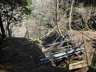 アッチ沢の枝沢の通過もヤバい。沢筋に落ちている木橋が往時を偲ばせますが、目の前の道を進んでも対岸には渡れないので、どうにかしてあの木橋のところまで降りなければなりません。