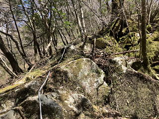 登り返してこの尾根の中で珍しく標識がある大タル山を越え、樹林の中の長いザレ斜面を慎重に下っていった先にフィックスロープが現れたら、そこから大タギリの底までは30mロープで3ピッチの懸垂下降になります。