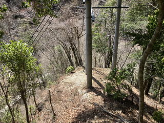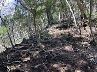 しかしそれも尾根の途中に立つ電柱までで、そこから先はとりたてて難しくはないものの斜度がきつく、スリップすればただではすまないという少々嫌らしい登りになってきます。予習段階ではこの尾根を下っている記録も目にしているのですが、実際に歩いてみて「逆コース(登り方向)にしてよかった」としみじみ思いました。