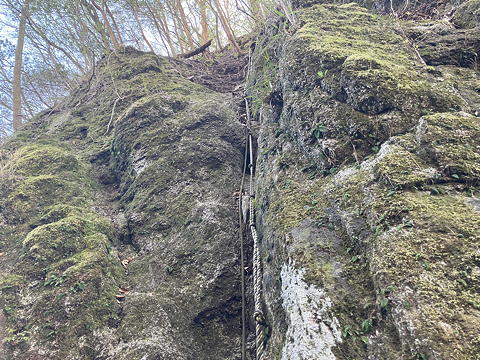 これは木橋のところから振り返り見た構図。鉄梯子やフィックスロープがありますが、梯子は壊れ、ロープは下まで届いておらず、しかも壁はほぼ垂直です。腕力に自信があればロープをつかんで降りることも可能そうではありましたが、それはこちら側から見て初めて言えることで、上からでは壁の状態やロープがどこまで届いているかを確認できません。かくして「山ではギャンブルはしない」がモットーの自分は、ためらうことなく自前のロープを出して懸垂下降でさっさと下りました。