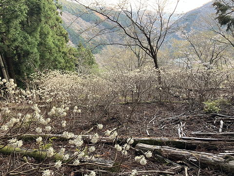 P687の周辺に、噂のミツマタ群落がありました。さすがにミツマタヒルズやエルドラドほどの密度はありませんが、それでも斜面を覆うミツマタの広がりは目を楽しませ、あたりに甘い香りが漂っていました。