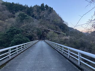 尾根の末端から右に折れて同角尾根を下り切り、沢を渡って車道に上がればミッション終了です。面白い山行でしたが、ちょっと時間がかかりすぎたようで、橋の上でバリエーション装備をリュックサックにしまい玄倉に向けて歩き出したときにはほぼ日没。玄倉に帰り着く頃にはすでに暗くなっており、そこから1時間弱の待ち時間を所在なく過ごした後に乗り込んだバスは、新松田行きの最終便でした。