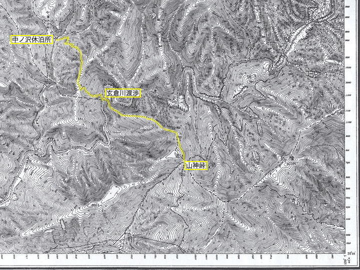 これは下りの途中から降りてきた尾根を見上げた構図で、ちょうど15mごとにしっかりした木が懸垂下降の支点を提供してくれるのが助かります。ここを逆に登るのはフィックスロープ頼りの難儀なアルバイトになりそうで、だからこそ当初プランでのチャレンジ要素にしていたのですが、あいにく今回はそれが実現しませんでした。もし、あらためてここを登る山行を計画するなら、下りは東沢乗越から東沢を下る(その途中で鉱山跡を見物する)ことを考えるだろうと思います。