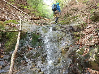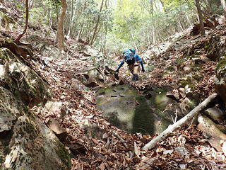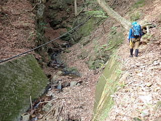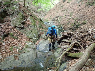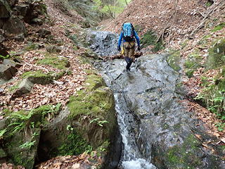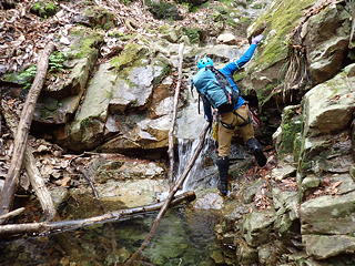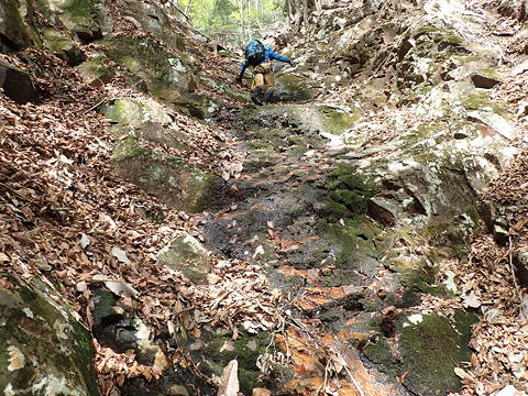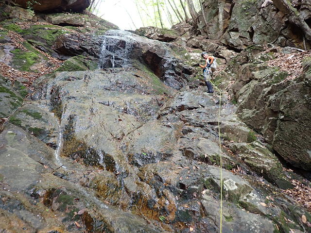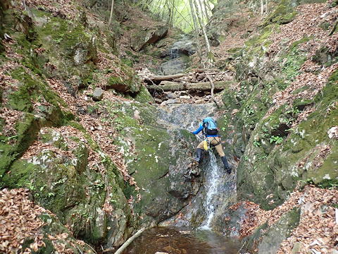 ここは私がリード。中央から右上を目指して登るかたちになりますが、途中2カ所に残置ハーケンがあったほか、ハーケンとハーケンの間ではカムが使え、さらに落ち口近くでは木の根にスリングを巻くこともできました(←片っ端からランナーをとりました)。最後の方は土や枯葉が堆積していてフリクションが利きませんが、しっかりした木の根がホールドを提供してくれるので、これをつかんでずり上がりました。ただ、落ち口の上に出てしまうと後続のビレイのためにセルフビレイをとれる場所がなく、やむなく沢の中に腰を下ろして岩に足を突っ張り肩がらみで確保態勢に入りました。