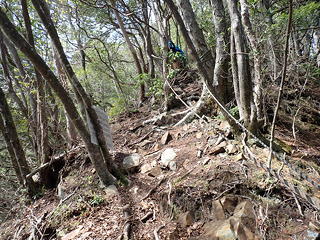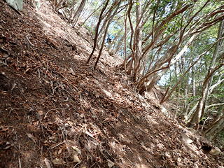 トラバースした先で登山道に出て、沢登りとしてはこれで一応終了です。そこは坪山の山頂から北北東に伸びる2本の尾根のうち「東ルート」と呼ばれる尾根で、この道に出たところで握手をかわしてから、引き続き坪山山頂を目指しました。