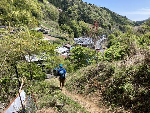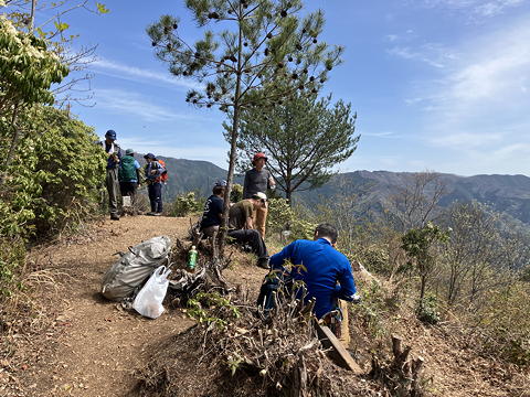 ちょっとした岩場の登りの先に待っていた坪山の山頂は細長い小広場になっていて、何人かの登山者が休憩中でした。ここはなかなかの展望台で、向こうに見えているのは過去何回かのハセツネで常に夜戦を強いられた笹尾根(遠い目)で、左端の登山者の先には三頭山がそびえています。また、これらの反対側には富士山の姿もあり、これらの眺めを楽しみながら沢装備を解き、行動食を口にしてから下山を開始しました。